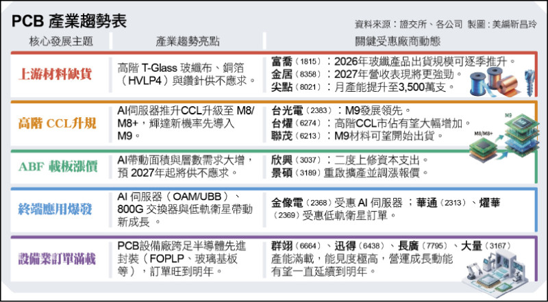 台灣各家PCB廠為滿足客戶訂單已自2024年起啟動大規模擴產,生產基地更進一步拓展至泰國,包括欣興(3037)、臻鼎-KY(4958)、金像電(2368)、華通(2313)、台光電(2383)、台燿(5274)、金居(8358)、定穎(3715)、尖點(8021)等公司,今年陸續有新產能開出,營運可望再上層樓。